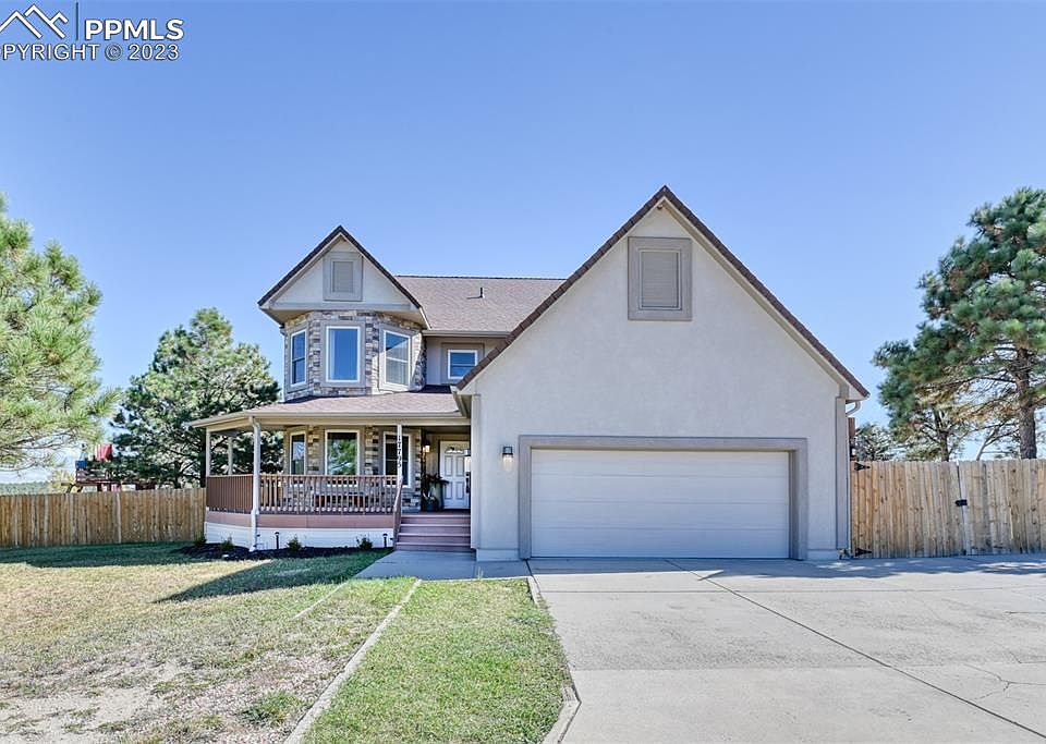 Remodeled two-story home in picturesque Walden III community on over 1/2 acre flag lot. *Home sits at the end of a quiet cul-de-sac with lots of beautiful trees and mountain views* As you enter front door you will immediately notice newer Acacia floor and nice size foyer. Main level boast eat in kitchen with bay window nook, island, 42 inch upper cabinets, solid stone counter tops & large pantry. Formal dining room that walks out to covered back porch with low maintenance Trex deck. Living room with gas-log fireplace. Hall bath with pocket door to laundry room. Spacious upper level has a large Primary bedroom with a sitting area that overlooks the beautiful pine trees, ensuite bathroom with double sinks, private toilet room, and connects to a huge walkout in closet with access to garage bonus storage space. Two additional generous size bedrooms both with ceiling fans, (one with a large walk in closet) and are conveniently located across from a full bathroom and linen closet. Wide stairs lead down to the finished basement featuring a wet bar with sink, second gas fireplace, 3/4 bathroom with built in storage shelving, and could make a great fourth bedroom if needed as it could easily have a closet under the staircase. So many upgrades to list- newer vinyl windows, stucco exterior, new white oak LVP on stairs and entire upper level, fresh new interior paint, new 50 gal water heater, covered front porch Trex deck, central Air Conditioning & furnace replaced in 8/2021, new light fixtures, new door handles/hinges, new light switches covers, new kitchen hardware & new garbage disposal. Completely fenced backyard with storage shed and RV parking. Heated oversized garage. *Lewis Palmer school district*