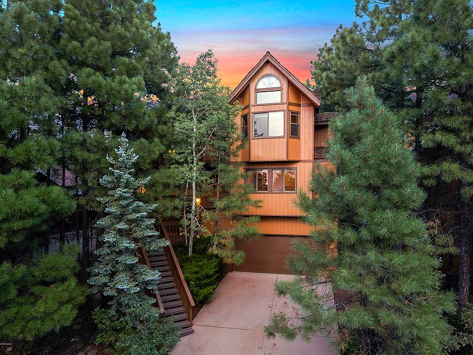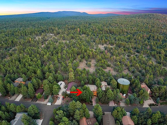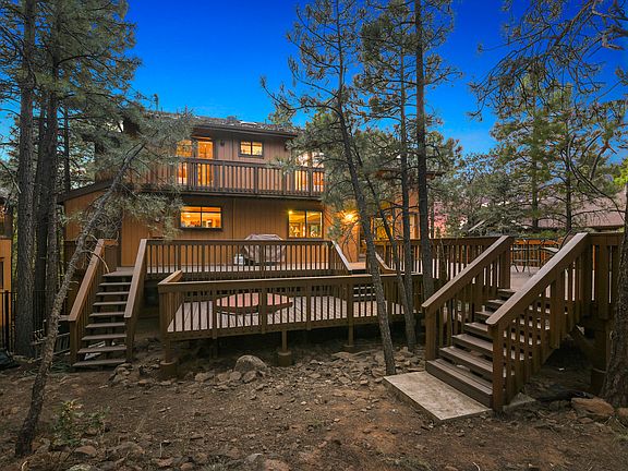 Marvelous in Munds Park! You will love the heavily treed lot, private cul-de-sac location, and backing National Forest. You even have your own private gate opening to National Forest to hike right out your backyard. It feels like you're nestled in the woods when inside and there are several decks to sit out and enjoy the sunshine and whisper of the wind in the forest. Relax out back in the hot tub under the stars. There is a sauna, too! This is ultimate tranquility in the pines. Enormous great room with tongue and groove soaring ceilings, walls of windows, and an extraordinary fireplace for those chilly evenings. Timeless kitchen with alder wood shaker cabinets, travertine tile, exposed wood beams, granite, and stainless steel appliances.