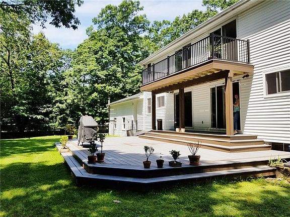 Very Unique Home in a gorgeous setting on picturesque country road. Perfect for the large/growing family or multi-generation living situation or help pay the mortgage. Currently used as a very large 6 bed Colonial. Legal 2 family (duplex) can easily be converted back but flows well as a single family. Also, bonus: guest quarters or home office above garage with full bath and laundry. Home features 2 fireplaces, kitchens (one currently used as an entertainment bar), 2 staircases. As duplex 3 beds each side (currently open), 2 car garage attached each side. New sliders lead out to beautiful new 20 x 30 decking and 2nd floor sliders lead to new balcony. Fenced in very private yard. Home features: Newer windows, roof has been replaced, new decks, remodeled baths, wood floors, 3 separate electric meters (bills) and 3 separate heating systems. 4 garages -- perfect for the car enthusiast or hobbyist. A truly great home. Excellent schools. Call for details. Or, take a look: Stop by Open House Sunday 30th 12-2.