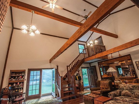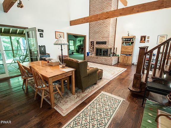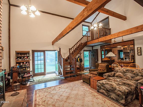 Mountain Retreat on 8 ACRES with gorgeous cathedral 25' ceilings and beautiful brick floor-to-ceiling fireplace. Getaway from it all in this 3 Bedroom, 2 Bath home with plenty of living space, an open floor plan, oak HW floors, an office, a wood stove and SS appliances. Open the French doors & allow the beautiful air to flow through the home. Sit on either your covered porch or screened-in deck to watch the wildlife & enjoy the peaceful outdoor sanctuary. Your cars & toys will love the spacious 3-car garage and the property has 2 sheds! New Bilco doors into crawl, new steps on screen porch, gutter guards on entire house, new water heater, updated bathrooms, 2 new dehumidifiers in crawl. This is the perfect hunters or wildlife retreat.