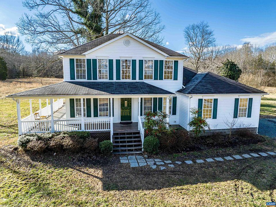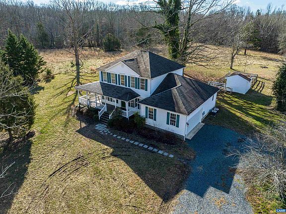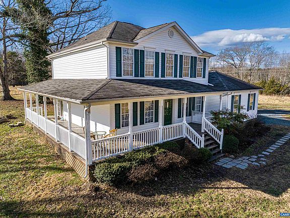 Location, Location, Location! Selling two lots together; for a total of 4.132 picturesque acres on Route 250; 24 min. to Pantops and 30 min. to Short Pump; 4 Bdrm, 2.5 ba farmhouse style with attached garage and beautiful wrap around porch! Main level Primary bedroom with hardwood flooring and walk in closet; Primary also has full bath attached; Spacious eat in kitchen and open living room with plenty of windows for natural light filled space; Laundry on main level; 3 nice sized bedrooms on 2nd level with loft area perfect for recreational space or sitting area; New refrigerator, stove and garage door in 2022; Some photos are professionally staged to provide ideas; Private setting with massive oak trees; No HOA or deed restrictions; easement for driveway access runs through Lot 4 (docs on file); 4 additional lots also for sale; Schedule your tour today!
