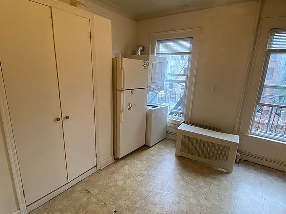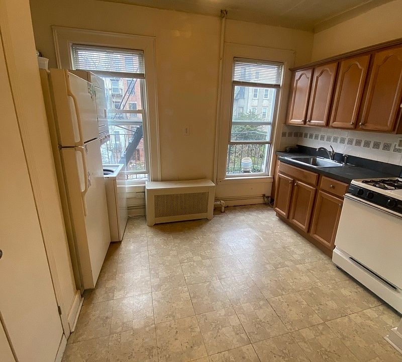 This is a 3 family walk-up building on a tree lined street and this apartment is on the 3rd. floor. Outside is one staircase which leads to the front door of the building and there are 3 doors to open to enter this building. Then there is just one more flight of stairs to reach this apartment. There is a washer and dryer in the kitchen so you don't have to leave to do your laundry. The kitchen is spacious with a pantry and has space for a dining room table. The windows overlook the backyard to this property. Windows throughout apartment allow for a nice cross ventilation during the warmer months. The living room is cozy and has a good sized closet. The bedroom has windows overlooking Carlton Avenue and there is another room about the size of a half bedroom which can be used as an office, a study, or a small bedroom for a small child or additional storage. This smaller room has storage shelves. You will need one month rent and one month security and one month realtor fee. Appointments to schedule a tour can be arranged by phone or email.