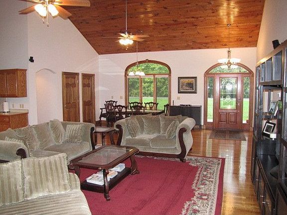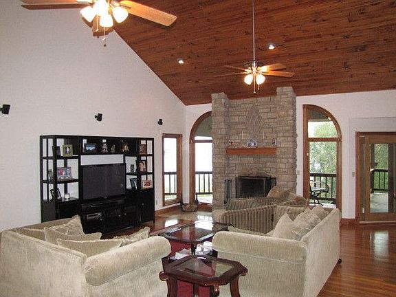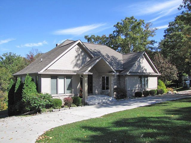 View of Shinbone on Lake Cumberland. Quality features throughout this 4BR, 3BA home include tongue and groove wood ceiling in great room and dining area, hardwood flooring in main areas, marble tile, beautiful stone FPs in great room and master BR, covered back decks with recessed lighting and ceiling fans provide a spectacular setting to watch the evening sunsets. Full walkout basement with finished bath will hold up to 4 cars and still have room for the toys! This is a must see!