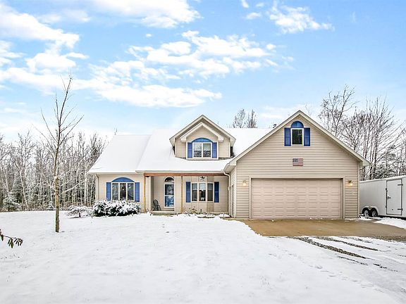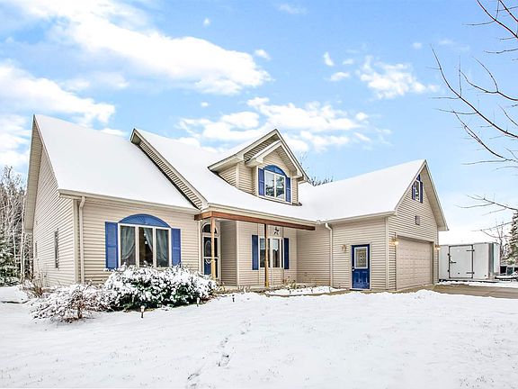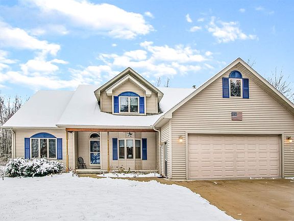 Truly one of a kind, this unique custom-built home on just under 20 wooded acres is extraordinary. From the time you cross the blue bridge over White Feather creek, the winding drive will lead you to this sanctuary, with trails, pond, & koi ponds. The land is breathtaking yet wait until you enter the front door through the foyer to the open living/dining room & modern quartz kitchen, with massive island joined by a double-sided gas fireplace. This impressive kitchen features Lloyd's cabinetry, under cabinet lighting, walk-in pantry & custom backsplash. Stainless appliances include gas stove with lighted knobs. First floor laundry, master suite & walk-in closet, generous master bath with double sinks, & jetted tub. 2nd story has 3 spacious bedrooms, bonus room, & large closets. Full walkout basement to garage, wine room, & salt free softener. Wood stove, security cameras, heated pole barn with half bath, & RV garage. Call today, this incredible home & pole building could be yours.
