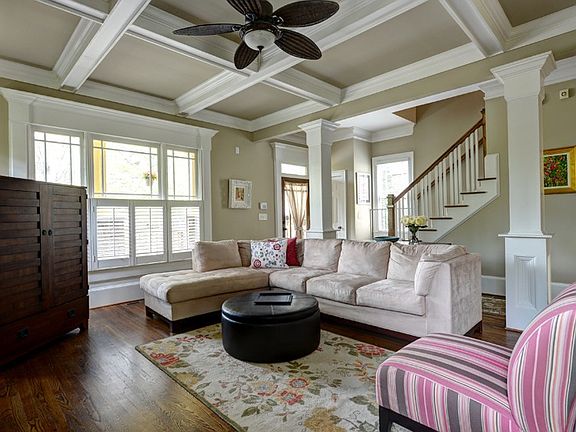 SUSAN SIMMONS 404-388-4409 susiesimmo@aol.com - Nestled in enclave neighborhood of Hawthorn Park located in sought after historic Kirkwood, this 2-story Charleston style Craftsman greets you from the treelined sidewalk--offering 4 bedrooms, 2.5 bathrooms, sun filled open floor plan with coffered ceilings, glass pane built-ins, hardwoods on main, eat-in kitchen, large sep DR, 4th office/ bedroom in basement, prvt fenced yard,dual covered porches,neutral pristine interior,new exterior paint, sep his/hers walk-in closets & oversized master suite.