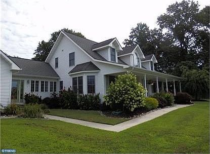 Come home to historic Mullica Hill, NJ and view this 4 bedroom, 4 1/2 bath Cape Cod. This home sits 700ft off the road on 6 SPRAWLING ACRES of land. LOG CABIN STYLE interior with pine planked walls throughout the main living area. Kitchen w/oak cabinetry, STAINLESS fridge, fresh water system, appliance station, island w/electric, pull out shelving, and eat-in area w/sliders to yard. The dining room has HARDWOOD FLOORING and bay window. Laundry rm w/1/2 bath, PANTRY. The lodge like living room offers BRAZILIAN CHERRY hardwood flooring, 2 chandeliers, wood burning FIREPLACE w/stone hearth, and dramatic VAULTED ceilings. Master bedroom w/brazilian hardwood and carpet inlay, 2 WALK-INS, bath w/Jacuzzi, double vanity, tile, shower. 2 upstairs bedrooms each w/full baths. Full FINISHED BASEMENT w/full bath, GRANITE wet bar, mini dishwasher, icemaker, fridge, recessed lighting, storage, and 2 extra finished rooms. Anderson windows and sliders, paved driveway w/mature landscaping, 2 1/2 car garage, alarm, water conditioner.