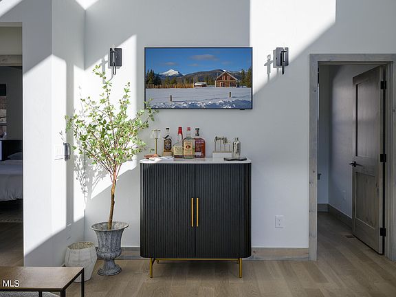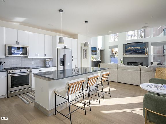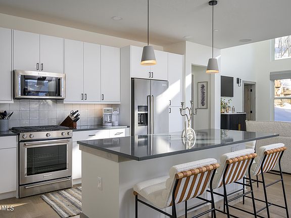 This three-bedroom end unit has a location just steps from single track trails, the Fraser River Trail and is a quick drive to Fraser or Winter Park. The views are east to James and Parry's along the Continental Divide and south to Winter Park Resort. Vaulted ceilings in the bright and open great room have windows upon windows floor to ceiling. The primary suite is on the main floor and the ensuite bath, like all bathrooms, has custom tile work, quartz countertops, contemporary light fixtures and heated floors. The kitchen design has room for everyone around the expansive, soapstone bar top which is perfect for entertaining but also comfortable for just a few people to relax after playing in the mountains.