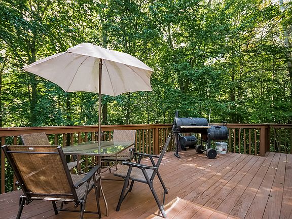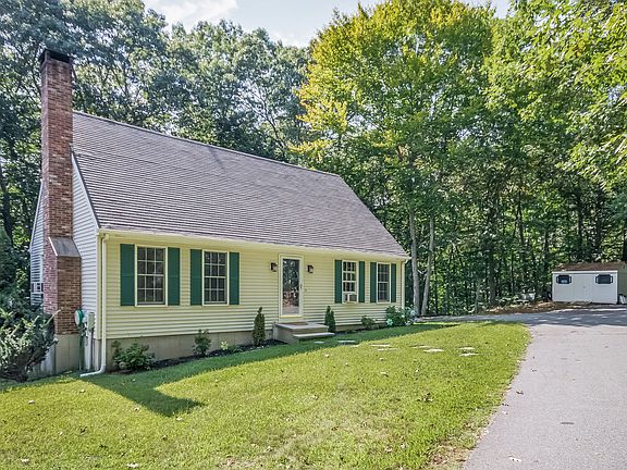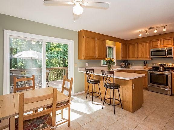Location, location! Privacy abounds at this perfect storybook 3 bedroom, 3 bath Cape. Only 2.1 miles to town, yet located on 5.72 private acres at the end of a cul-de-sac. Beautiful eat-in kitchen has Corian counters plus a breakfast bar. Lovely hardwood floors throughout the first floor. Living room has brand new wood stove. Master bedroom has it's own bath. The basement is finished and walks out to another deck. Square footage includes 345 sf finished space in heated, walk-out basement. New roof! The shed will stay, plenty of room for a future garage.