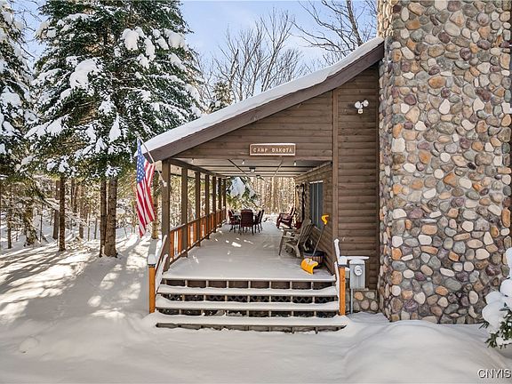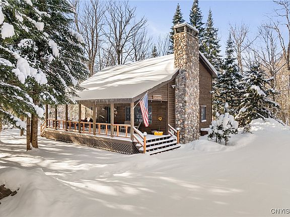 5 ACRES OF PRIVACY, a wonderful log-sided cabin with nature at every window and a short walk to town. It does not get any better than this! The beautiful wood burning stone fireplace can be enjoyed throughout the open great room area. Main floor bedroom and full bath adds to the desirability and functionality of this home. Curl up with a good book in the loft area warmed by a propane stove. The full basement has a game room and TV/office/bonus room. A large front porch overlooks 5 acres of woods and a wonderful fire-pit to enjoy with friends and family. Cross country ski trails, McCauley Mountain Ski Area/Mountain Bike Trails, Moose River, snowmobile trails all nearby. 3 years rental history.