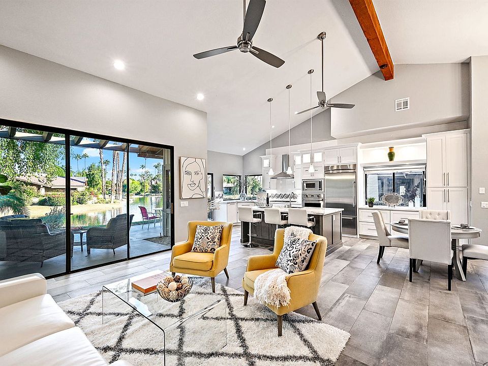 You need not look any further. This two bedroom, two bath plus den home in The Lakes Country Club has it all. Sitting on a lake with eastern exposure where you can enjoy your morning coffee or afternoon cocktails the kitchen has been remodeled with custom kitchen cabinets, Viking and Thermador appliances, wine cooler, an 8 foot center island, pendant lighting, and granite countertops to create a beautiful kitchen that is opened to the living room and dining area. There is new porcelain flooring, a New Justice Design 12 light entry foyer fixture plus 40 new recessed lights throughout the house. Both bathrooms have new vanities with vessel sinks and new faucets. The guest bath has a barn bathtub enclosure with whirlpool tub and the master bath has a frameless shower making it easily accessible for all. Also there are four new remote controlled ceiling fans giving air-flow to the home when its a beautiful desert day. The Lakes Country Club is completing a renovation on their clubhouse which is expected to be completed in early spring 2021. The new gym/spa has been completed boasting state of the art equipment, workout areas and a lap pool for those that swim. There are 27 holes of championship golf, tennis courts, POP tennis and pickle-ball courts in the outstanding tennis facility. You need to see this home quickly, as it will not last long.