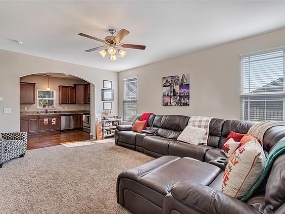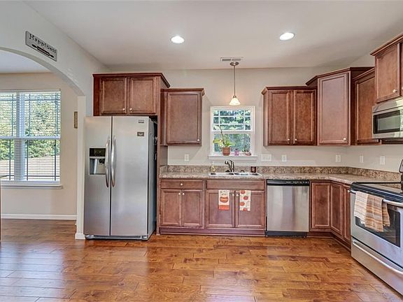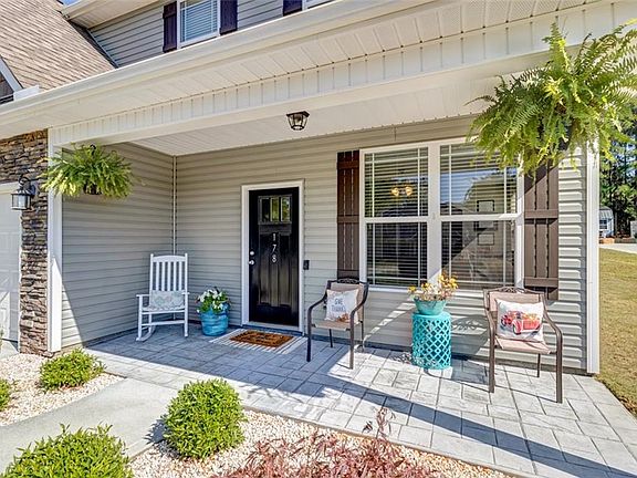 This is a beautiful craftsman 2017 home in immaculate condition. It has gorgeous siding details and sits on a large level lot. When you enter this 1800 sq ft home you come under a charming covered front porch large enough to sit and enjoy your neighbors and enjoy a glass of tea. The front door brings you into a large living room with a kitchen in the rear of the house. There is a nice window over the sink so you can see the large level back yard and the woods behind you The dining room is to the left and leads you out to a large covered patio. Lots of room to grill, entertain and just enjoy the family. There is also a 1/2 bath on the main level Upstairs you will find the Master suite large full of light and a nice walk in closet. The bathroom is private to the master bedroom with double sinks, linen closet garden tub and private commode room with door. It also has a large separate shower. The large window over the garden tub affords privacy glass and still light There is more light and shutters through out the entire home. There are 3 more large bedrooms, another full bathroom and large laundry room upstairs. This house seems almost brand new when you walk through , the owners have kept in incredible condition. The carpet is in near perfect condition, hardwood floors in the large kitchen and dinning room with open windows to the back yard. There is plenty of room for a growing family in this delightful neighborhood. There is a common area in front for the mail box center for the neighborhood, but it built behind a gorgeous wooden pergola type area with nice landscaping surrounds this architectural feature The garage is two cars and has room for storage along the sides and only one step in.
