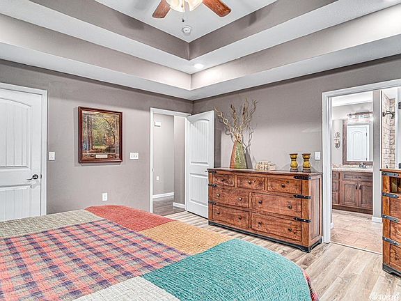 Looking for a home with rock accents and a beautiful rustic fireplace to stay warm and cozy? This three bedroom home with tile hardwood style flooring and luxury plank in the primary suite is a beauty. The deep garage is a plus and this home offers a large Island kitchen with a breakfast bar, all stainless appliances, dining area, huge covered patio on back, split bedroom arrangement, enjoy country living close to town and check this home out before it's gone