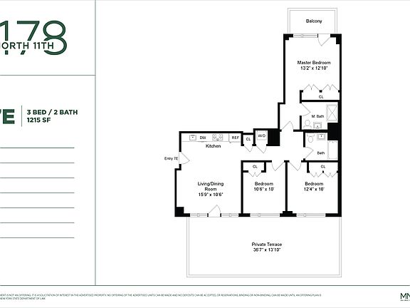 *Beautiful 3 Bedroom 2 Bathroom with Private Terrace Available 9/23 in Williamsburg!* One block from McCarren Park, 178 North 11th Street is a brand new collection of 49 boutique residences epitomizes stylish and practical living. This is a sun lit, beautifully-appointed three bedroom/2 bath apartment. The unit features a large private terrace with views of the Manhattan skyline and Empire State Building. The custom Italian kitchen includes Aspen Oak base cabinetry and glossy lacquered upper wall units, Caesarstone countertops and premium appliances including a dishwasher and oversized 5 burner range. The two spa-like bathrooms feature double sinks, an oversized tub/shower, bright white lacquer Italian vanities, Toto toilets, Kohler medicine cabinets, and gleaming Grohe fixtures. *Other unit features include:* - Washer/dryer in unit - Walk-in closet - En-suite private master bathroom - Radiant heated floors - Central air - Blackout shades Over-sized, double-glazed windows allow sunlight to illuminate the sophisticated interior design, artfully finished with a neutral color palette and wide plank wood floors. Elegantly appointed and meticulously designed, these apartments are perfect for entertaining and relaxation. *Building amenities include:* - Landscaped roof deck - Gym - Virtual doorman - Bike storage - Parking garage - Storage units available Images are for illustrative purposes and may not reflect the exact unit