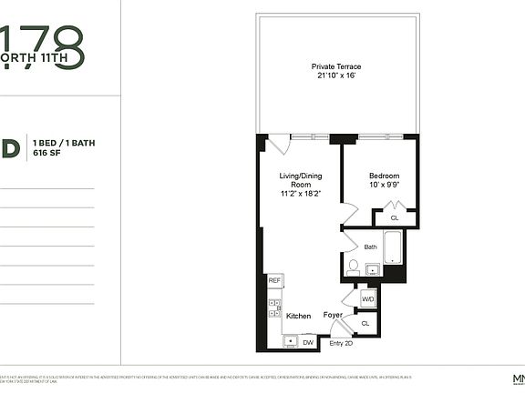 New 1 Bedroom Now Available Now offering 1 month free! One block from McCarren Park, 178 North 11th Street is a brand new collection of 49 boutique residences epitomizing stylish and practical living. This is a sun-lit, beautifully-appointed one bedroom apartment with a huge private terrace. The unit features a custom Italian kitchen with Aspen Oak base cabinetry and glossy lacquered upper wall units, complemented by a soft fusion of light grey and white Caesarstone countertops, and premium appliances including dishwasher and 5 burner gas range. The spa-like bathroom features bright white lacquer Italian vanities, Toto toilets, Kohler medicine cabinets, and gleaming Grohe fixtures. Other unit features include: - Washer/dryer in-unit - Black out shades - Stainless steel appliances - Walk-in closet - Wide plank hardwood floors Building amenities include: - Landscaped roof deck - Gym - Virtual doorman - Bike storage - Parking garage - Storage units available - Washer/dryer in unit Over-sized, double-glazed windows allow sunlight to illuminate the sophisticated interior design, artfully finished with a neutral color palette and wide plank wood floors. Elegantly appointed and meticulously designed, these apartments are perfect for entertaining and relaxation. Price is net effective for 1 month free on a 12 month lease term *Images are for illustrative purposes only and may not reflect this exact unit