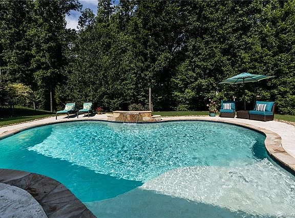 This is your chance to have your own resort! This property has it all! Beautiful saltwater gunite pool with a wade-in shelf and water feature, stone fire pit with a seat wall, covered a seating area with a bar wired for electricity and TV, and plenty of yard left for fun. The grand entrance features a tile mosaic inlay. The home has a wonderful open kitchen with all the counter space you could need for cooking and entertaining. In addition to 5 bedrooms and 4 and a half bathrooms, there is a large bonus room upstairs with many possibilities. The bedroom and full bath on the main floor are perfect for guests and in-laws. Upgrades galore, plantation shutters, hand scraped wood floors, stone see through fireplace between the living room and kitchen/eat in dining area, and custom moldings. Reference the map to see the wooded lot behind the property.