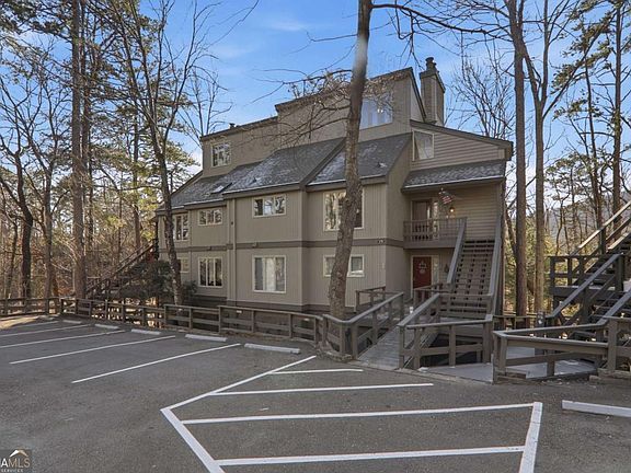 Beautifully maintained top-floor, end-unit condominium located just inside the gates of Big Canoe. This 3-bedroom, 2-bath, two-story home offers excellent privacy and a peaceful, wooded setting with seasonal views of Lake Disharoon, the Creek golf course, and surrounding mountains. The main level features a spacious great room with a stacked-stone, wood burning fireplace and built-in bookcase, opening to a bright dining room with a beamed cathedral ceiling. The updated kitchen includes Jenn-Air stainless steel appliances, modern fixtures and beamed cathedral ceiling. The main-level primary suite offers access to the screened porch and features an updated, full bath with double vanity and glass-front linen cabinet and 2 spacious closets. The laundry is conveniently located on the main level. Upstairs are two oversized bedrooms with beamed cathedral ceilings, ample closet space, and sliding doors to the upper deck. A large spacious bath is shared by the 2 guest rooms, there is also a large storage space and linen closet. All bedrooms provide deck access, enhancing the indoor-outdoor living experience and offering views and wooded privacy. Outdoor living includes two large decks, one screened, providing multiple spaces for relaxation or entertaining. The property is conveniently located near Big Canoe amenities, including golf, tennis, fitness center, pools, lakes, boating, hiking trails, waterfalls, and clubhouse dining. This home is currently operated as a 2nd home and vacation rental with established rental history, offering flexibility for personal use or investment purposes. Recent updates include a new roof (2025), repaired and painted walkways (2025), understory tree removal (2025), and an A/C tune-up (2025). On-site trash facility is available for guest and resident use as well as a lovely courtyard with 2 gas grills and sitting areas.