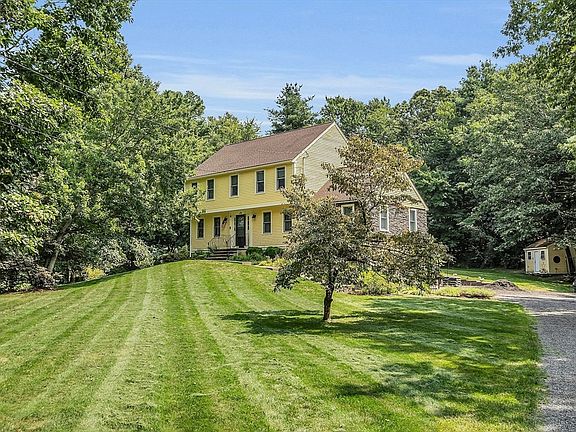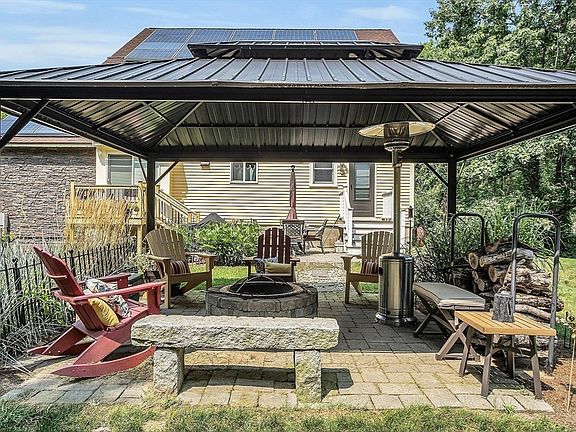 Imagine a charming 3-bed, 2.5-bath colonial home designed for functional convenience, updated with modern touches and newly painted inside and out providing comfort and style. In the kitchen, new countertops provide ample space for meal prep and the breakfast bar is perfect for morning coffee or a quick snack. A large pantry, half-bath and separate laundry are just down the adjacent hall. Host dinner in the elegant DR then relax in the spacious LR with vaulted ceiling and pellet stove. Recharge in the primary BR where a serene private bath and custom walk-in closet await. Work from the 1st Floor, front office with built-in shelving and retreat to the outdoor oasis with stone fire pit, patio and new deck providing a true retreat from the hustle and bustle of everyday life. New stone veneer wraps the garage exterior adding style and a layer of insulation. Energy-efficient solar panels. All bathrooms updated with life proof porcelain tile, modern vanities and lighting fixtures.