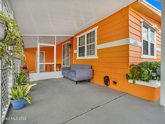 Beautiful, cozy 2 bedroom/2 bathroom home in the desirable 55+ community of Palm Bay Colony. The open concept plan features a nice kitchen with stainless steel appliances, a bar perfect for entertaining, laminate flooring throughout, a large screened patio, and a fully fenced back yard.