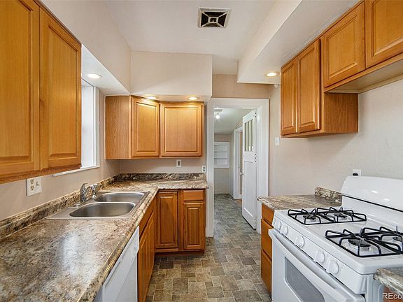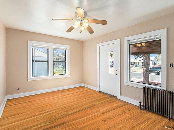 Welcome to this charming 2 bedroom, 2 bath home with an oversized 1 car detached garage and rare finished basement! New window coverings and new interior paint! Newly refinished original hardwood floors on the main level. Eat in updated kitchen with newer cabinets giving you ample cabinet space and a brand new range. Sun room/office/flex room with brand new carpet. There are 2 non conforming bedrooms in the basement bringing the total to 4 potential bedrooms. Newer 40 gallon water heater and newer boiler. This home sits on a spacious lot with fully fenced back yard and a covered front porch. Large driveway for extra parking. Conveniently located hear the Stanley Marketplace, public transportation, Montview Park and City Park. Don't miss this one!