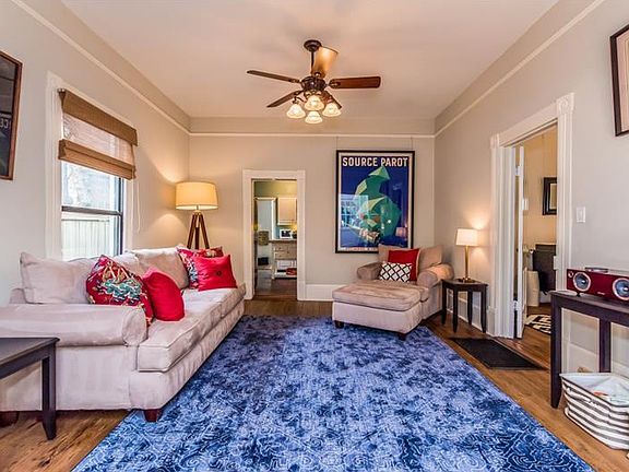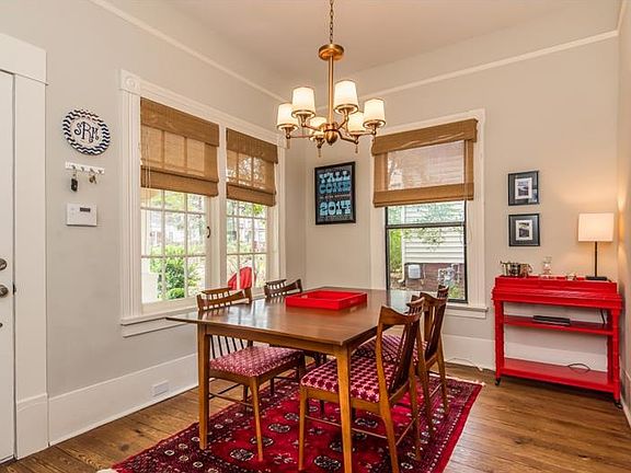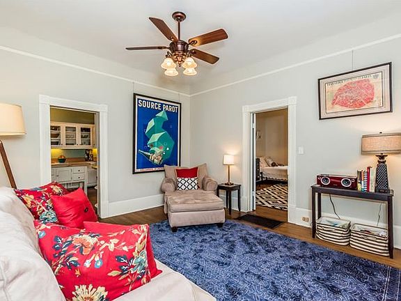 Adorable Cottage in the heart of Lake Claire. Casement windows open onto covered front porch. Historic hdwds. Updated kitch w/White Cabinets, solid surface countertops, stainless appliances & vaulted ceiling. Master w/updated bathroom & large closet. Large Secondary Bedrms. 3rd Bedrm features built-ins, vaulted ceiling, skylights, & French doors to deck, also functions well as a den. Deck w/built-in seating, looks onto flat, fenced yard. Large Brick Patio provides plenty of space for entertaining. Completely rebuilt Storage Shed offers bar & add'l storage. Newer HVAC.