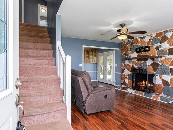 **Charming Country Home with Wrap-Around Porch on 2.95 Acres** This unique dollhouse-like home, sets far back from the road on 2.95 level acres and offers the perfect blend of country tranquility and modern convenience. With 1,442 square feet, all hardwood flooring except on steps/landing this delightful property features three bedrooms and two baths. As you approach, you'll be greeted by a lovely wrap-around porch from the front to the side that invites you to relax and soak in the stunning views of the picturesque farmland across the street. The main level hosts a spacious primary bedroom with an ensuite bathroom, ensuring privacy and comfort. An inviting eat-in kitchen flows seamlessly into the cozy living room, complete with a charming stone fireplace—perfect for cozy nights in. The utility room adds practicality to your everyday life, while the two additional bedrooms and full bathroom are conveniently located upstairs. The property includes a detached garage/workshop equipped with electricity and concrete flooring with storage space above with pull down steps catering to hobbyists and DIY enthusiasts. A breezeway connects the garage to the house, ensuring you stay dry on rainy days. Freshly painted interior and a new roof on house and garage (04/03/2025) New HVAC system- (1 yr old) New duct work- (1 yr old) Tankless water heater (1 yr old) will provide peace of mind, allowing you to move in and enjoy without the hassle of renovations. With no restrictions and just minutes from downtown, you can relish the best of both worlds: the serenity of country living and the convenience of urban amenities. This charming doll-house is waiting on its new owners. Let it be you!