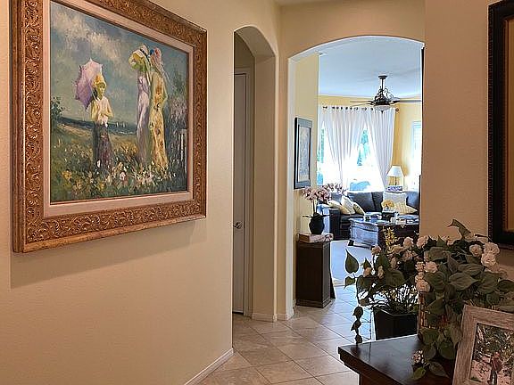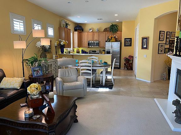 Designer home in Solera. Beautiful 2 bedroom, 2 bath+Office with Great Room Concept: 10’ ceilings throughout the home, cozy fireplace, plantation shutters, leading to beautifully landscaped backyard oasis, with flagstone patio and walkways, for a private retreat. Dwarf fruit trees, lavender and roses. Almost new Stainless, microwave, dishwasher and oven. Beautiful Master Suite, garden tub, huge walk in closet, and laundry room. Alarm system installed. Solera at Oak Valley Greens is a 55+ Active Adult Community With 24-Hour Gate Guarded Security, adjoining a Gorgeous Golf Course. The Community offers a Clubhouse with many Social Clubs and activities; Indoor Jogging Track, Fitness Center, Tennis Courts, Saltwater pool/Spa, Library, Bocce Ball and Billiards. The Solera 55+ Community has a Picturesque Mountain backdrop, and is Freeway close(I-10) -A short distance to fabulous shopping in(Cabazon or Palm Springs). Medical Facilities close by & short drive to charming city of Redlands.