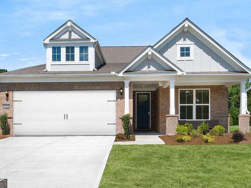 Beautiful Mystique MODEL HOME with ALL the Bells and Whistles Ready for you to call Home in Lakecrest, active adult 55+ new construction neighborhood by Lake Lanier. Welcoming rocking chair front porch and extended rear covered patio perfect for outdoor entertaining. Views of hardwoods from your back yard make this homesite one of the best in the neighborhood. Loft addition is ideal for your game room and a private set up for guests. Well-appointed finishes include double French doors on your study on main, hardwoods throughout main, shiplap accented walls, designer grade tile and ceramics. Gourmet kitchen with upgraded quartz, 42" upper cabinetry and built-in ss appliances opens to the gathering room. Low HOA dues cover all lawn maintenance. Conveniently located near shopping, dining, recreation, and healthcare.