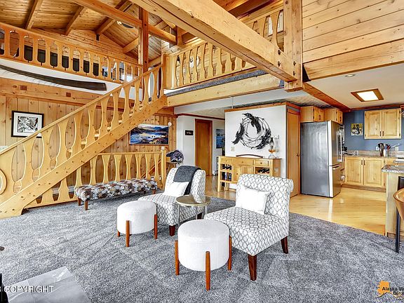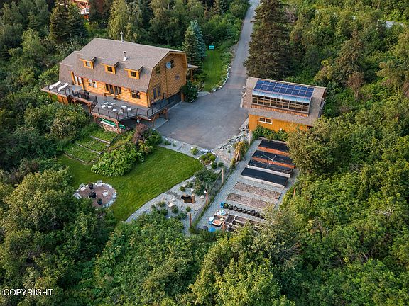 Alaskan Living At It's Absolute Finest! Stunning Log Home w/Views & Beautifully Landscaped 1.25 Acres. Garden's Dream w/ Greenhouse & 1500 SF of Fenced Veg Garden. Open Concept Great Rm, Tall Ceilings & Wood Stove. Light Detached 300+ SF Outbuilding perfect for Home Business or Rec Rm. Theater w/ Wet Bar. Main Level Master Suite w/ Attached Office or Nursery. 2 BR/1 BA on Lower Lvl. 1 BR/1 BA UP