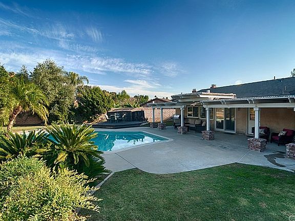 Beautiful single level home in a family friendly neighborhood, on a cul de sac, footsteps from the highly-rated Yorba Linda Middle School. The 12,000-square foot lot boasts two separate garages, a private backyard with a large pool, spacious covered patio, fruit trees and plenty of grass area for family gatherings. The second garage is 650 square feet, with negotiable car lift, lots of driveway space to hold many cars and an RV. A beautiful oak front door greets you as you enter. Four roomy bedrooms, the master has a slider that leads you right out to the pool, it also has a walk in closet and its own bath with dual sinks. The spacious living room has soaring ceilings, a marble fireplace, plantation shutters and lots of built in storage. Recently upgraded bathrooms, newer dual pane windows and sliders, upgraded kitchen with stainless steel appliances and granite counter top. Indoor laundry room with lots of storage. Located within a short walk to parks, restaurants, shopping and the Yorba Linda Community Center.