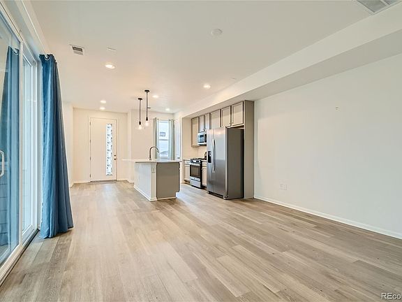 The kitchen is the centerpiece, equipped with stainless steel appliances, a gas stove, and a large island that serves as a breakfast bar. Above, pendant lights illuminate the quartz countertops.