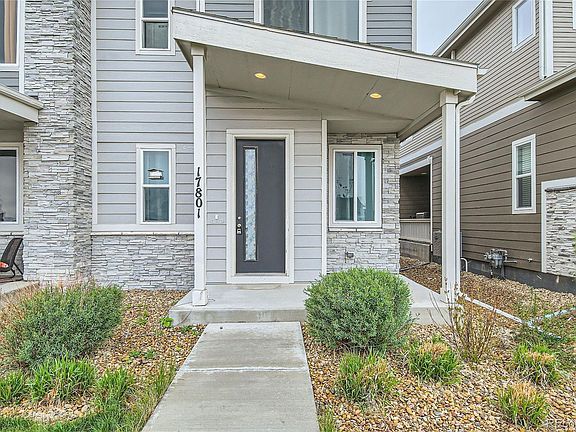 Explore the clean, modern design of 17801 E 96th Ave, a home featuring stylish stone accents and a welcoming porch. Inside, the spacious living area is filled with natural light from large windows and glass doors, with neutral colors that make it easy to add your personal touch.