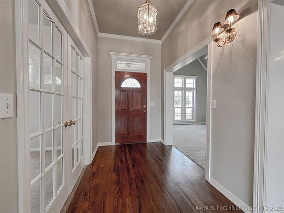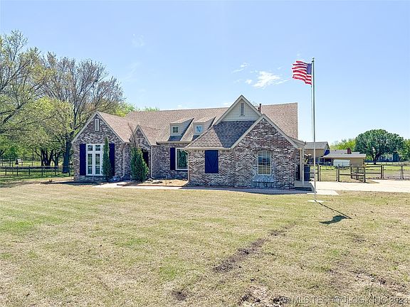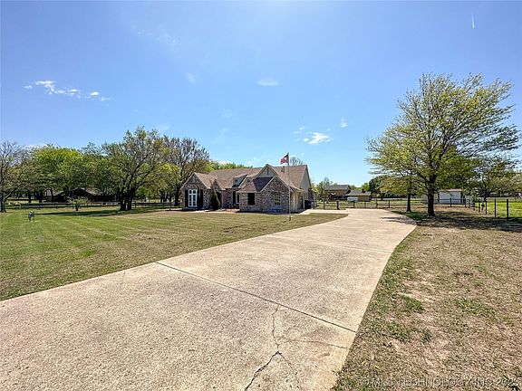 Country living, close to all that is Owasso! This wonderful home on a 1 acre lot features 4 bedrooms (or 3 bedrooms and office), formal living room, formal dining room, 2 full baths, and 2 car side entry garage. Living area includes gas log fireplace and built-ins. Formal living area features vaulted ceiling. Island kitchen with great storage, vaulted beamed ceiling, and spacious breakfast area. Large primary bedroom includes tray ceiling, spacious walk-in closet, and private bath with separate vanities, whirlpool tub, and separate shower. Large laundry room with closet. Exterior features include covered patio, large deck, storage sheds, gutters including leaf guards, whole home generator, and fully fenced backyard. Recent improvements include interior paint including doors, baseboards, and cabinets in baths and laundry., refinished wood floors. Other improvements include energy efficient vinyl windows, HVAC, and newer roof.