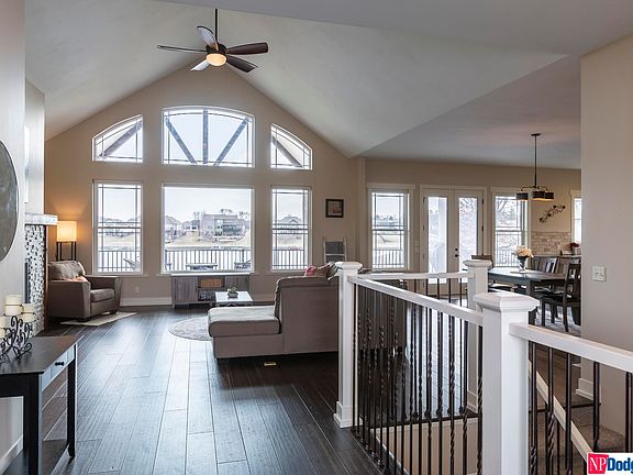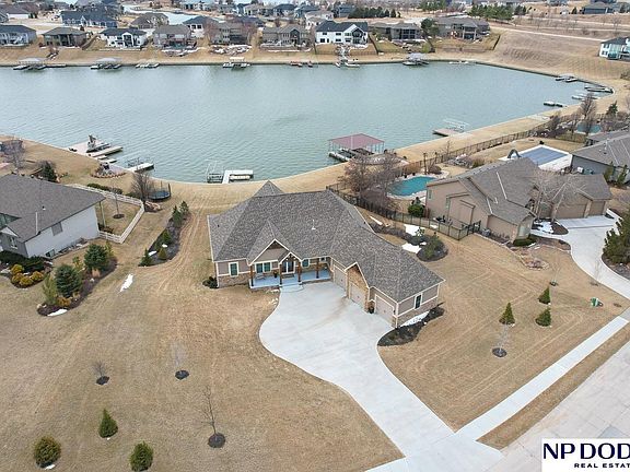FOR THOSE WHO DREAM OF ENCHANTING DELIGHTS…this lake home is a dream come true! The home offers breathtaking views & found on the lake’s largest NO WAKE cove. It boasts a spacious & airy interior with plenty of natural light & soaring ceilings. Prepare meals in this well-designed kitchen with gas cooktop, large island, & ample counter space. An enormous mudroom offers a half-bath, laundry room, drop zone, & large walk-in pantry. The primary bedroom with 10 ft ceilings & tall streamline windows offers stunning views of the lake. Private moments are more special in your luxurious primary bath. Never feel like you are in a typical Nebraska basement because of the 12 ft ceilings, plus they helped create a flat backyard with NO retaining walls. The rec room is the perfect party place with a projector, surround speakers, wet bar, & room for a game table. The rest of the lower level has 3 oversized beds & 2 full baths. Dock, Boat lift, Jet-ski lift, & Hot Springs Hot-tub are all included.