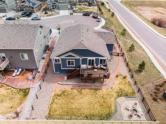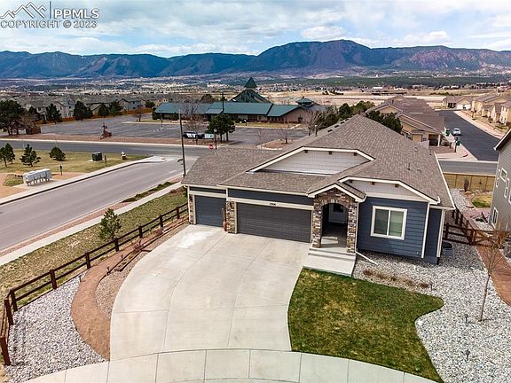 Beautiful ranch floor plan at end of cul-de-sac with garden level, on premium lot, has a fenced in backyard and upgraded oversized deck with outstanding views of Pikes Peak. Outdoor features a fire pit, natural gas stub-out accessible to the deck, 3 stall garage with 220 volt outlet and added shelving. Inside there are 3 bedrooms on the main floor and a finished basement with a large family room, with two additional bedrooms and a full-size bath.