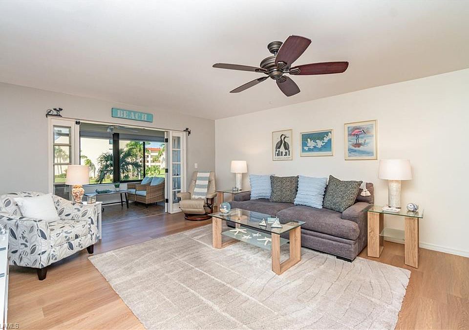Enjoy the best of Florida living in this beautifully updated 2-bedroom, 2-bath, second-floor condo overlooking the water in the highly desirable Seven Lakes Golf & Tennis Community! This light and bright home features a remodeled kitchen with a tray ceiling, updated lighting, granite countertops, and stainless-steel appliances. A convenient pass-through window to the dining area is perfect for entertaining. The interior has been freshly painted and includes new luxury vinyl flooring and baseboards throughout. Both bathrooms have been tastefully upgraded. The primary bath offers a walk-in tiled shower, and the guest bath features granite counters and a tiled tub/shower combination. Additional highlights include plantation shutters, a full-size stackable Samsung washer and dryer (2022), HVAC Trane system (2020), and water heater (2021). Relax year-round on the spacious lanai with hurricane resistant windows and hurricane shutters. This condo is being offered furnished with a King Bed in the primary bedroom and a Queen Bed in the guest bedroom. It includes a covered carport and golf cart space. Seven Lakes is an active 55+ community with an executive golf course (no transfer or green fees!), six heated pools, six Har-Tru tennis courts, pickleball, bocce, shuffleboard, fitness center, library, woodworking and craft rooms, billiards, and an on-site restaurant and lounge with regular social events, dinners, and dances. Pet-friendly (one pet up to 25 lbs.) and securely gated with 24-hour guard. HOA fees include golf, tennis, water, cable/Wi-Fi, trash, building insurance, and exterior maintenance—residents only pay for electricity! Conveniently located across from Bell Tower Shops, near fine dining, shopping, and just a short drive to RSW Airport and Southwest Florida’s beautiful beaches.