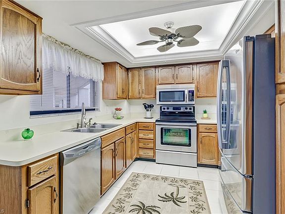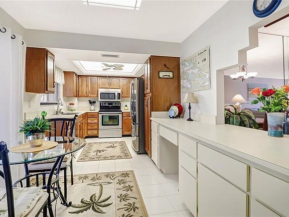 LOVELY and LARGE 2/2 split bedroom condo offering a CORNER location ( ONLY 16 offer this open layout with with an amazing expansive golf and lake views from oversized lanai. The minute you walk into the property you will see why this should call this home. Tray ceiling, stainless kitchen appliances, opening the kit. wall and built-ins and eat in kit. makes this ideal. New tile and laminate. A/C 1 Year old ( 2019) Large master with large walk in closet, and additional storage on lanai will come in handy. Hurricane and storm shutters have been added for additional protection. Golf cart storage and carport are included and golf cart can be purchased separate and outside of closing is a huge plus and ALL ASSESSMENTS for renovations of the golf course have been PAID by owner!! Community is gated active 55+ and so convenient to so many conveniences!! Close to beaches, shopping and SWFL airport. Seven Lake offers unlimited golf, with NO cart or trail fees, pickle ball, har tru tennis courts, 6 pools, bocce, shuffleboard, library, woodworking shop, fitness center, billiard room, bar and restaurants.