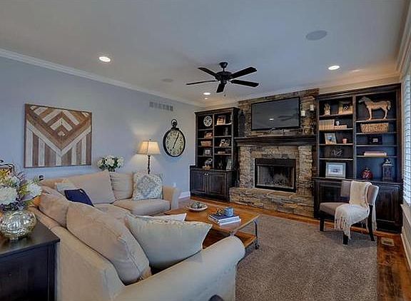 Better than new! Stunning 2-Story with flex living spaces like main floor bedroom. Why have cookie cutter when you can have beautiful finishes like hickory hardwood floors, custom blinds, stone fireplace, gorgeous built-ins, upgraded granite counters and more. Kitchen features island w/seating, gas stove, stainless appliances, large walk-in pantry & an abundant storage. Luxurious master suite offers upgraded vanity tops, dual shower heads, jetted tub & well designed walk-in closet. Mud area & fenced yard with deck.