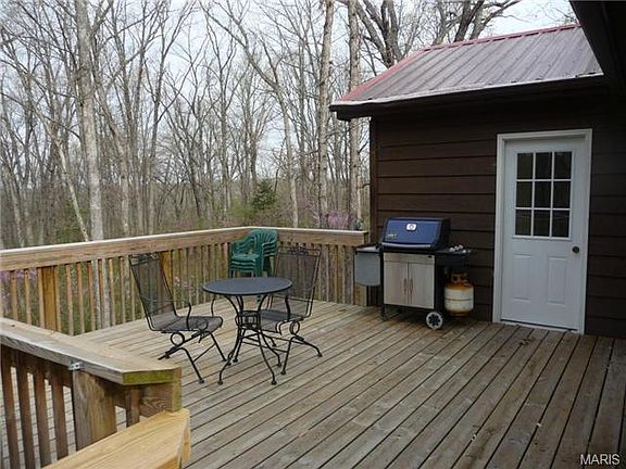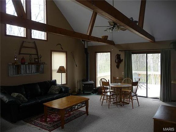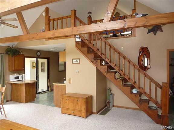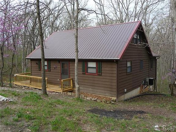 Lots of privacy in this one and one-half story home on a cul-de-sac and wooded lot adjoining Mark Twain Lake public land. Trails to lake and seasonal views of the lake. Bedroom and bath on main floor along with laundry. Great room has vaulted ceilings with stained wood trusses and wood stove. Stained wood staircase leads to loft bedroom. Kitchen has range and refrigerator. Stacked washer/dryer stays. Central heat and air. New larger deck and new walkway. Large storage shed. Lots of gravel for boat parking. Close to Spalding Boat Ramp and Beach and Mark Twain Landing water-park.