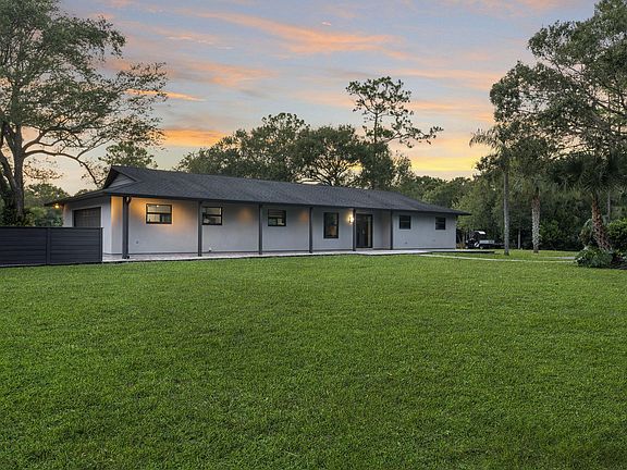 Welcome to 17813 133rd Way N. One must see this property to truly appreciate all it has to offer. Two paved driveway entrances unfold unto this expansive four beautifully landscaped fully fenced park like acres. Wonderfully maintained mature oaks and pines form a pristine wildlife sanctuary that surrounds a serene bass stocked pond. The acreage backs to a nature preserve to the west providing spectacular sunsets with endless views that continue to enhance its natural overflowing beauty.Here sits the fully updated ranch and re-imagined home featuring all hurricane rated impact glass, open concept floor plan with fully updated kitchen quartz counter tops stainless-steel appliances including the gas range w/ hood, fully updated bathrooms, wood look tile flooring throughout, new doors and trim custom shelving closets, recess lighting throughout, custom built-in contemporary gas fireplace with surround sound TV. All space smartly utilized including the finished garage flexible space. The exterior of the home is stucco finished, with full wrap around brick paver patio, outdoor shower, & summer kitchen grilling station installed.