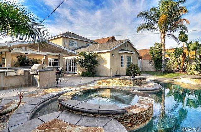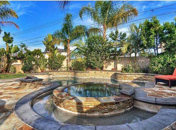 Beautifully Remodeled, Highly Upgraded & Expanded w/$200K Backyard. Top-Quality Materials & Exquisite Architectural Details & Design went into Making this Home & the Breathtaking Resort-Style Backyard Spectacular! Tankless Water Heater, Dual-Pane Windows, French Doors, Hardwood Flooring, Recessed Lighting, Central A/C, Smooth Ceilings, Plantation Shutters, & Stacked Stone Fireplace in Formal Living Rm. Luxurious Downstairs Master Suite w/Retreat, Custom Organized Walk-In Closet. Spa-Style Granite & Marble Bathroom w/Tub, Walk-In Shower, Custom Cabinetry & Fixtures. Gourmet Kitchen w/Granite Counters, Center Island, Desk Niche, Custom Cabinetry, Stainless Appliances Inc. Wine Fridge, Micro & Professional Gas Stove w/Hood. 4 years newer heater & A/C. 3 Bedrooms & Remodeled Bath Upstairs. Tons of Storage Closets & Attic. Entertainer's Tropical Paradise Backyard w/ Pebble Tec & Stacked Stone Pool & Spa with Water Features & Baja Deck, Plus Raised Fire Ring, Lawn Area, Stucco Wall Fencing, & Raised Stacked Stone Planters. Covered Outdoor Living Room with Lighting & Cable TV Hook Ups & a Built-In BBQ Center/Outdoor Kitchen with Wrap-Around Sitting Bar. 'Finished' Garage w/Custom Flooring, Cabinetry, Built-In Sitting Benches & Counters. Close to Beach/Schools