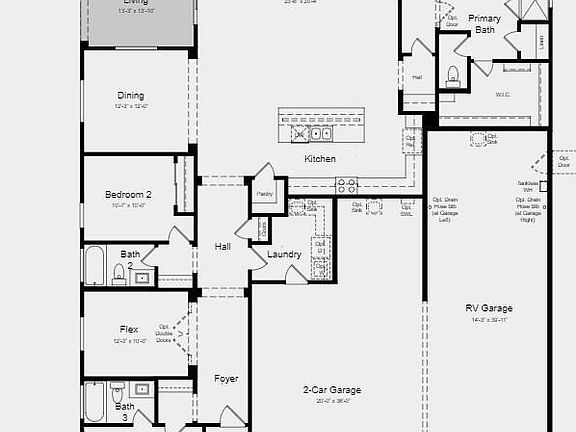 MLS#6731453 August Completion! The 55-RV2 layout at Allen Ranches is a one-level design featuring 2,392 sq. ft. with 3 bedrooms, 3 bathrooms, a 2.5-car garage, and a dedicated RV garage for ample storage of all your vehicles and gear. The design emphasizes an open-concept kitchen, gathering area, and dining space, perfect for family meals and entertaining. It also offers a covered outdoor living space, with an option to extend, enhancing the indoor/outdoor lifestyle. The master suite includes a large walk-in closet and a bathroom with dual sinks. This floor plan is designed to be your ideal home. Structural options include: paver front porch, garage service door, outdoor living extension, RV garage prewire for HHVA mini split, soft close cabinets, two tone egg shell paint, 2" faux wood blinds, and super shower.