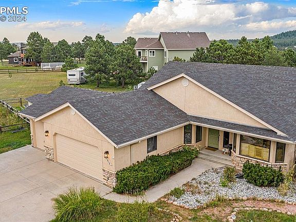 This charming residence is situated at the end of a cul-de-sac in a tranquil neighborhood. The home's living spaces flow seamlessly into one another, creating an open and inviting ambiance. The great room boasts high beamed and vaulted ceilings, big windows that flood the room with natural light, and ample space for a living area and a dedicated dining section. Adjacent to the bay window is a cozy nook complete with a walk-out and gas fireplace. The kitchen is equipped with abundant storage options, including multiple cabinets, a pantry, and a kitchen island. Vinyl floors, stainless steel appliances, granite counters, and a breakfast nook add to the kitchen's allure. The primary bedroom is private and complete with a 3/4 bath and walk-in closet. Attached to the home is an oversized 3-car garage. The backyard has a wraparound deck, split rail fencing, mature trees, a chicken coop, and a storage shed. With views of the Black Forest and expansive stretches of open land, this residence is the epitome of Colorado lifestyle and main level living at its finest.