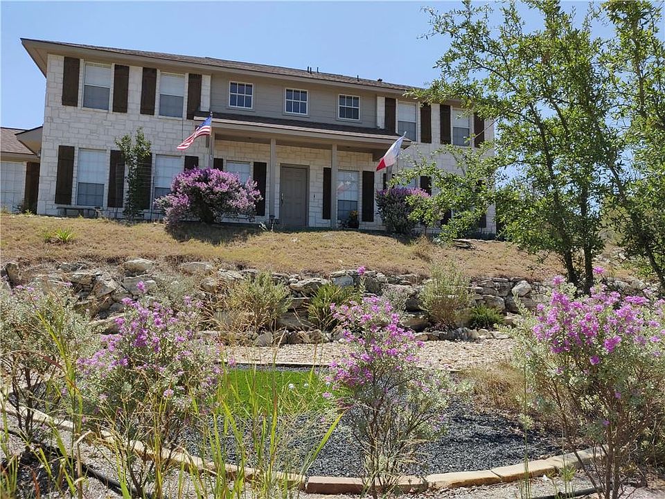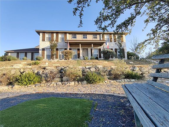 Home is one of the highest lots in the neighborhood with fantastic hill country views. Features include 4 bedrooms + office, 3 full baths, 2nd living can be a formal dining/flex. Kitchen is wonderful, oak floors and windows galore for great natural light. Large, recently stained wood deck surrounded by limestone adjoins oversized concrete walkway for outdoor entertaining. Water is on well system with softener/chlorinator/filtration. Views from the front porch include soothing water feature. There is also a serene sitting area with bench to sit and enjoy nature. There is a small garden with storage shed/workshop.