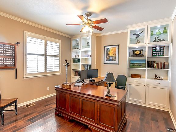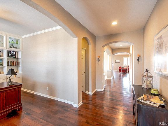 Settled on a corner lot in the beautiful neighborhood of Horseshoe Ridge you’ll find this fantastic ranch home boasting a generous gourmet kitchen, freshly updated finished basement and a peaceful backyard facing a greenbelt and walking trail. Step into the foyer to discover a sophisticated study with built-in shelving and elegant dining room welcoming you into the home. Rich hardwood floors lead into the open, eat-in kitchen, a chef’s delight featuring a large granite breakfast bar island, double oven and step-in pantry. A vaulted ceiling and gas log fireplace create an inviting living room, an ideal gathering place at the end of a long day. Enter a serene retreat in the spacious primary suite illuminated by a bay window, hosting two walk-in closets and an en suite five-piece bath. Two additional bedrooms, full bath, powder room and laundry room complete the main level. The updated finished basement is the epitome of additional living space with brand new luxury plank flooring, a vast flex space, brand new kitchenette, two bedrooms and full bath. Outside is an entertainer’s dream offering a covered patio complete with a ceiling fan, plus an extended paver patio. Other features include a Tuff Shed and an attached 3-car garage with workbench and cabinet storage. Minutes away from downtown Parker and the trails of McCabe Meadows, this community has something to offer everyone. Don’t miss out on the chance to make this your new home!