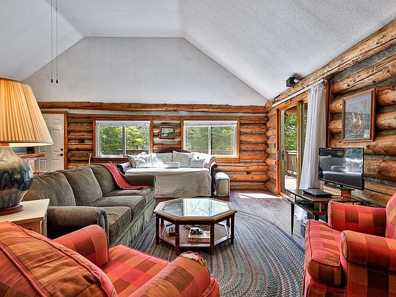 Traditional log homeSoaring vaulted ceilingsRustic charmModern comfortInviting covered front porchNew deck railingsClassic woodstove