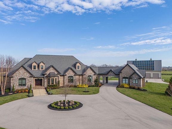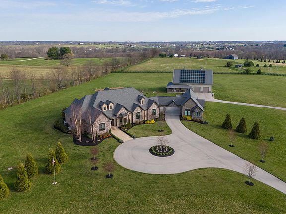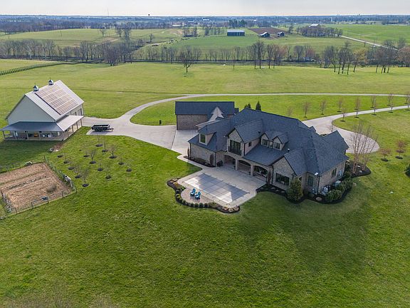 This farm sports fabulous views of an iconic horse farm & an ideal location. The gorgeous 2019 custom-built home has all of the extras you desire- elevator, Control 4 system audio, video thru-out the house in every room, gourmet kitchen with Miele appliances, the kitchen opens to the 2- story great room w/ gas log fireplace, covered brick porch w/ fireplace overlooking the heated Salt-water pool. 2nd floor man cave w/ wet bar & Juliette balcony overlooks the farm. The house has a deluxe master suite w/fireplace, fabulous light fixtures, art studio, partially finished basement, geo-thermal heating/cooling system. Security cameras w/ recording 24/7 controls, lights and gate from home or afar, & remote gate control. There is a 22 kw Generac propane generator, 1000-gallon buried propane tank, automated irrigation system. 3-car attached garage, motor home garage, separate barn w/ additional garage spaces, tons of storage, solar panels, orchard. Additionally, there is a 2750 square foot 2nd income/rental house with 10 foot ceilings, large pantry, beautiful lighting thru out, walk-in tub, full unfinished walkout basement, covered patio & electric gate. Starlink Internet on both houses