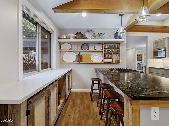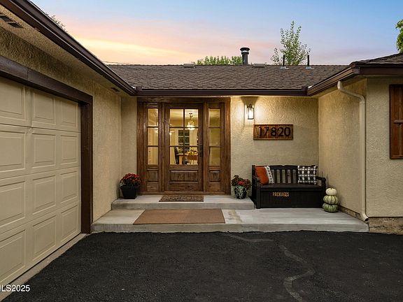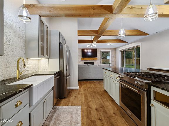 A Rare Countryside Sanctuary in South Reno. Set upon a lush and private one-acre parcel, this exquisite residence in Pleasant Valley offers a lifestyle that is both refined and deeply connected to nature. With the serene sound of Steamboat Creek flowing just beyond the garden, every moment spent here feels like an escape into your own park-like retreat. Inside, the home has been remodeled from top-to-bottom with a modern French country aesthetic that perfectly balances elegance with warmth. Expansive windows frame sweeping views of the grounds, while all-new flooring flows seamlessly from room to room. The chef's kitchen is a work of art, featuring soapstone countertops, custom tile backsplash, stainless steel appliances, exposed ceiling beams, a dual-basin farmhouse sink, spacious walk-in pantry, and ample storage and cabinetry. It opens effortlessly into the living room, where cozy evenings by the fireplace are elevated by the home's timeless charm. The primary suite is a private haven, complete with direct patio access, a walk-in closet with custom built-ins, and a spa-inspired bath. Designed with indulgence in mind, the en suite showcases Carrera marble finishes, soft gold accents, a freestanding soaking tub, oversized shower with continuous Carrera marble tile from floor to ceiling, and a tasteful printed wallpaper accent, all set against serene landscape views. A secondary bedroom and a versatile office/den of equal size provide additional flexibility, while the three-car garage includes a finished hobby room with power and climate control. Beyond the residence, the grounds unfold into a storybook setting, including, 4.5 acre feet of water rights specific to this property. Mature trees, vibrant lawns, and a flourishing raised-bed garden equipped with automatic drip irrigation, offer an abundance of fresh produce including strawberries, blackberries, tomatoes, green beans, peas, herbs, and more. A newly poured rear patio invites outdoor living and entertaining against the peaceful backdrop of nature. For those who embrace the equestrian lifestyle, a charming bridge leads to a dedicated horse facility: a 60-foot round pen, 30x30 storage barn, 12x24 run shelter, and dual 12x60 attached paddocks—all secured with horse fencing. Additional amenities include two storage sheds, a chicken coop, and freshly re-asphalted parking for RVs, trailers, or recreational toys. Backing to association-owned land, the property also enjoys unspoiled open space vistas and uninterrupted greenbelt views. Every detail has been thoughtfully curated—from smooth hand-textured walls and designer lighting to upgraded insulation and fine finishes throughout. Tucked away in the countryside of Pleasant Valley, yet minutes from freeway access, dining, and shopping, this rare estate seamlessly combines tranquility, elegance, and convenience.