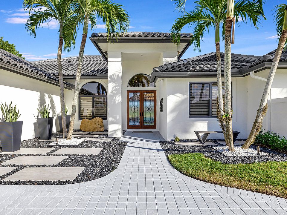 A MUST SEE! This stunning Jill Greene designed lakefront Stonebridge CC home is situated on a cul-de-sac with gorgeous lake and golf course views. There are custom upgrades throughout with no detail overlooked. All solid wood/glass interior doors, custom kitchen with 42' cabinets, SS appliances, quartz counters, custom built-ins, Italian tile floors, porcelain island bar, oversized primary suite, remote blackout shades, dual sinks, freestanding tub, power vanity drawer and so much more....Newer roof, all impact doors/windows, new hardscape landscaping, freshly painted interior and exterior, and saltwater, heated pool. Stonebridge CC is a mandatory membership club. Social memberships can be purchased if available.