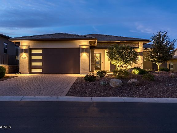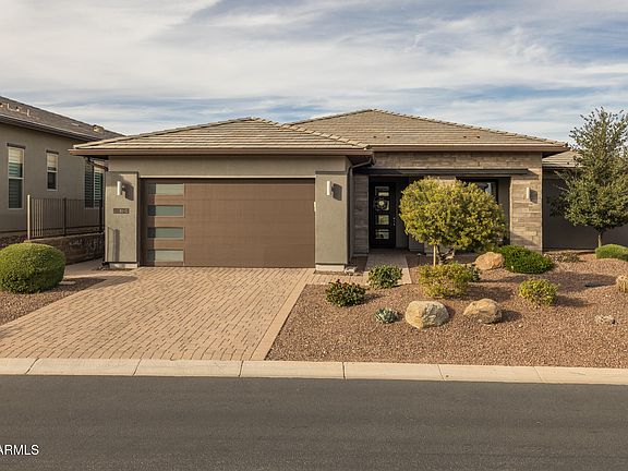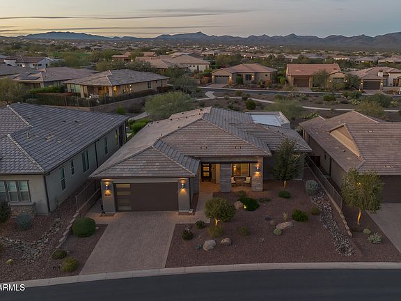Welcome to this beautiful home with mountain views from the backyard in the desirable Trilogy at Verde River community! The Brasada floorplan offers a thoughtful layout with 2 bedrooms, a den, and 2.5 baths. This home features upgraded flooring and shutters throughout, plus a smart space with a built-in desk. The kitchen showcases dual-toned granite countertops, a large island with breakfast bar, Monogram appliances, a beverage cooler, and a stunning tile backsplash. The great room has a multi- slide door that opens to the backyard. The primary suite includes dual sinks, framed mirrors, and a spacious tiled shower. Outdoors, the serene backyard is designed for both relaxation and entertaining, featuring an extended covered patio with three ceiling fans, a built-in BBQ, gas plumbed Ooni pizza oven, and a stone fire pit. Travertine pavers, artificial turf, and Sonoran landscaping blend seamlessly to tie the space together into a cohesive, low-maintenance retreat. Additional features include a 250-gallon propane tank, reverse osmosis, and soft water system.