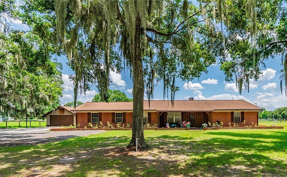 This lovely 3 bedroom 2 bath home boasts an open floor plan, spectacular wood burning fireplace, huge inside laundry room, attached double garage, large brick patio with brick BBQ grill and more! Sitting on over 3 beautiful picturesque acres, fenced and cross fenced with a 3072 sq ft barn that has 200 amp service separate from the house. Metal Barn has 5 lighted stalls with new ceiling fans and water in each stall with metal and wood slat heavy duty sliding doors on the front and back of all stalls, plus a huge paddock area (great for parties or add more stalls) There is also a sizable tack room, and an air conditioned office with 1/2 bath and shady garden sitting area. In addition there is a welded 220'x115' fully lit arena (6 concrete light poles-underground wiring) a viewing stand, holding pens, cattle chute, return lanes and gate levelers to open from horseback. Added feature are the waterlines for irrigation and dust control (in fact there are water spigots in multiple locations throughout the property) Don't miss the 70' round heavy duty exercise pen, just behind barn it's wired for a hot walker. This property also includes a 768 sq ft detached workshop (w/220 available), a solar and battery powered front gate, plus a 10x10 storage shed. The entire property is very well maintained and truly move in ready. Electric panels were recently updated and hot water heater is also fairly new. Come check it out---This is a one of a kind property- bring your horses and finally live the dream!!